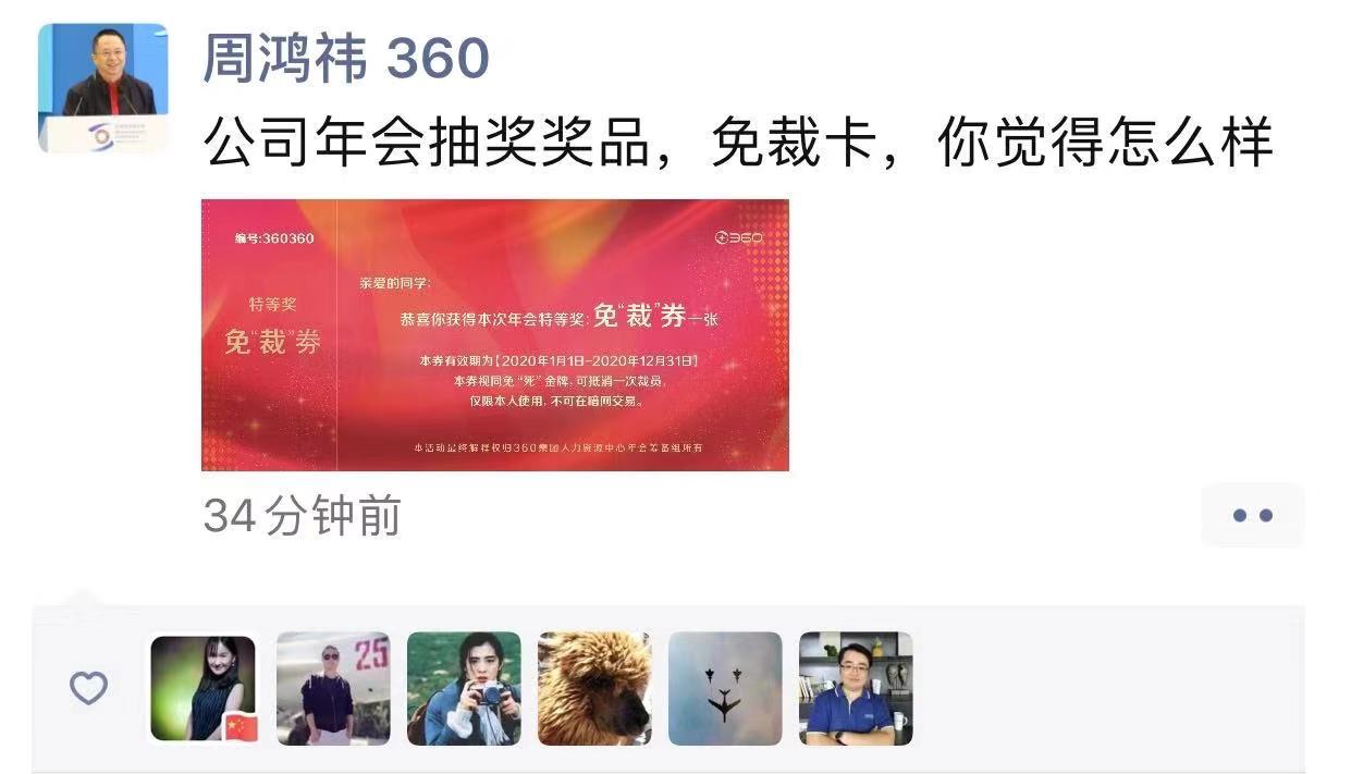 1月8日,360董事长兼CEO周鸿祎发朋友圈称,今年360公司年会的特等奖为免“裁”券一张,本券视同免“死”金牌,可抵消一次裁员,该券有效期为2020年1月1日至2020年12月31日,仅限本人使用,不可在暗网交易。