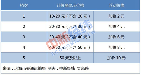 珠海市将分档次涨价,即在按现行运价标准实行打表计程收费的基础上,根据计价器显示的价格,分5档每次额外一次性加收2-10元的费用(非累进制)。例如,计价器显示金额为25元,则浮动价格属于第2档次即加收4元,该次应收运费为29元。