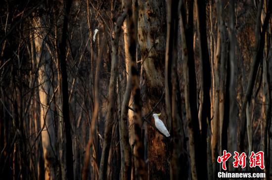 当地时间1月11日,在澳大利亚新南威尔士州普罗维登斯门的科斯库兹科国家公园,一只硫冠凤头鹦鹉坐在燃烧的树木中间。