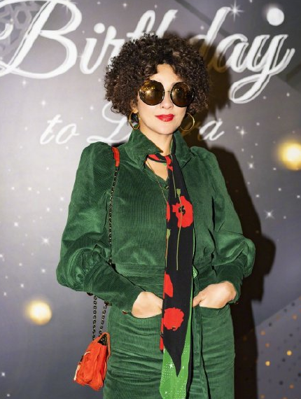 只见刘嘉玲身穿一袭绿色丝绒套装,身材高挑,皮肤白皙,烈火红唇增添几分霸气,大墨镜遮面,爆炸头很抢眼。