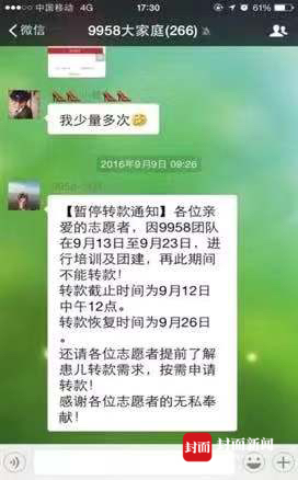 据新京报报道,2016年9月9日,中华儿慈会9958救助中心工作群“9958大家庭”内,群成员收到工作人员刘跃向项目志愿者发送的《暂停转款通知》。通知中称,“因9958团队9月13日至23日进行培训及团建,在此期间不能转款”,通知随后附上了转款起止时间。