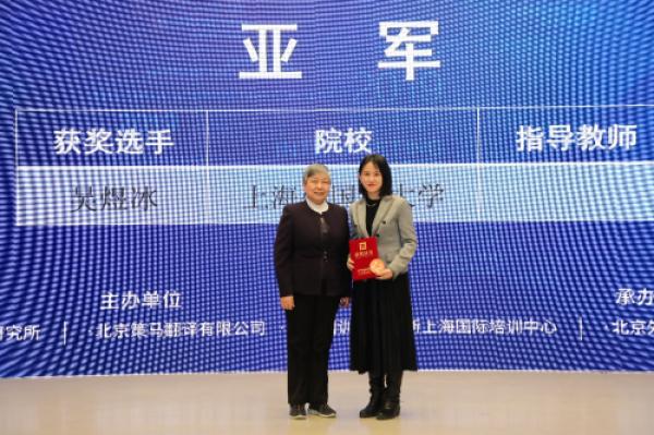 策马翻译(集团)副总裁文毅为最佳组织奖获奖单位北京外国语大学英语学院代表路兴书记颁奖