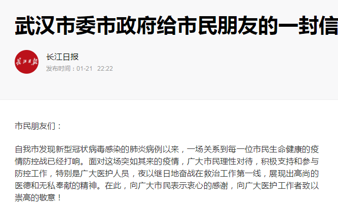政知君注意到,就在21日晚间,武汉市委市政府给市民发了一封信。