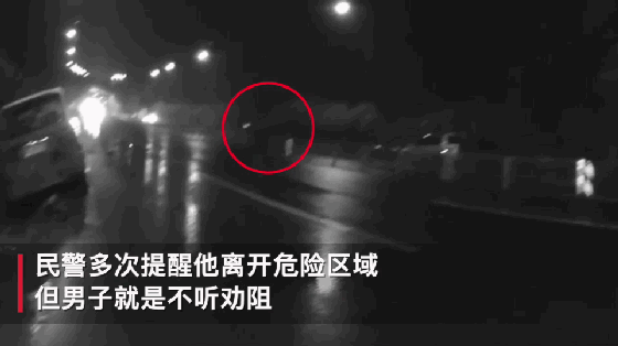当晚下着大雨,男子来回穿梭在马路上拍照,非常容易造成交通事故。民警发现后多次劝阻,可他就是不听,还反呛民警,“干嘛?,我自己的命我都有数。”
