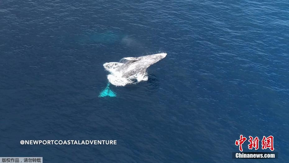 当地时间1月22日,美国加州新港出现成群灰鲸,时而越出水面,时而喷出水柱形成小彩虹。