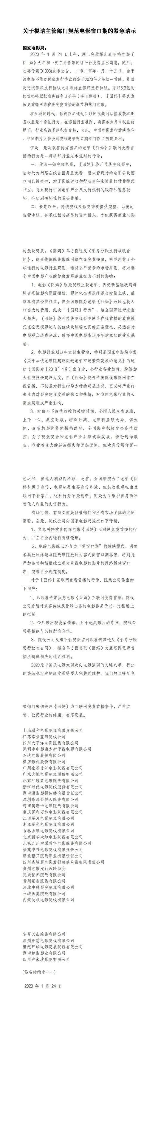 院线公司呼吁国家电影局紧急叫停欢喜传媒电影《囧妈》互联网免费首播的行为,并在行业内进行听证论证。取缔电影院以外各类“零窗口期”的放映模式,明确各类放映终端与院线影院放映内容之间窗口期界限,特别是严加监管初始报批立项为院线电影的影片的网络播放窗口期,完善行业规范制度。