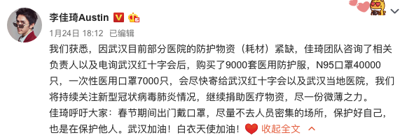 网易娱乐1月26日报道 近来,新型冠状病毒肺炎疫情引起了全国人民的关注,不少明星都捐献物资为疫情最严重的地区武汉助力。其中,网红李佳琦和薇娅团队都及时为武汉贡献了一份救助力量。李佳琦表示:“我们获悉,因武汉目前部分医院的防护物资(耗材)紧缺,佳琦团队咨询了相关负责人以及电询武汉红十字会后,购买了9000套医用防护服,N95口罩40000只,一次性医用口罩7000只,会尽快寄给武汉红十字会以及武汉当地医院,我们将持续关注新型冠状病毒肺炎情况,继续捐助医疗物资,尽一份微薄之力。佳琦呼吁大家:春节期间出门戴口罩,尽量不去人员密集的场所,保护好自己,也是在保护他人。武汉加油!白衣天使加油!”