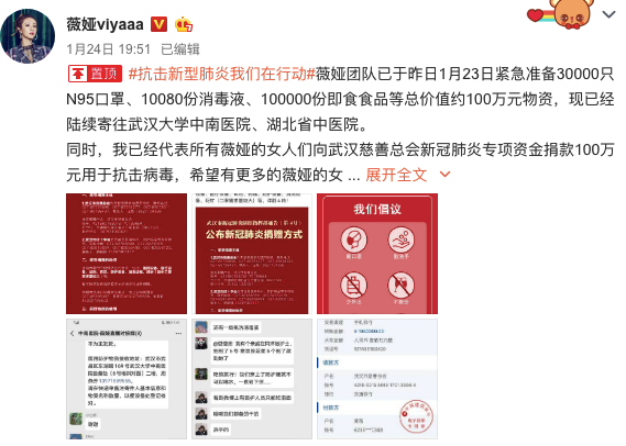 薇娅也发声表示已捐款100万元用于抗击病毒,并送去约百万元紧急物资:“#抗击新型肺炎我们在行动#薇娅团队已于昨日1月23日紧急准备30000只N95口罩、10080份消毒液、100000份即食食品等总价值约100万元物资,现已经陆续寄往武汉大学中南医院、湖北省中医院。同时,我已经代表所有薇娅的女人们向武汉慈善总会新冠肺炎专项资金捐款100万元用于抗击病毒,希望有更多的薇娅的女人加入我们,为武汉助力!薇娅的女人们,大家也要保护好自己,不要去人员密集的场所,出门一定要记得戴上口罩,同时注意好口罩的正确佩戴方法。 保护好自己,就是我们这个时候最应该做的!我们会持续关注新型冠状病毒后续情况,继续为武汉尽微薄之力!武汉加油,我们与你们在一起!”