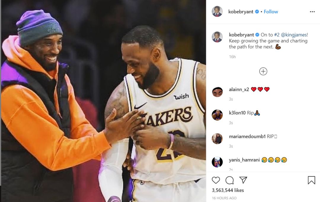 科比的最后一个图享,是跟拉布朗·詹姆斯兄弟般击掌互勉的合影。