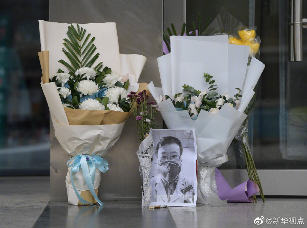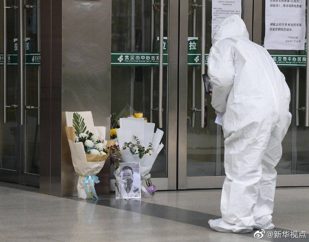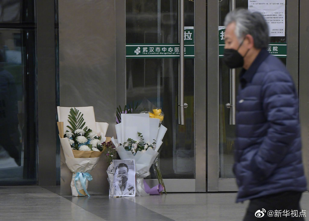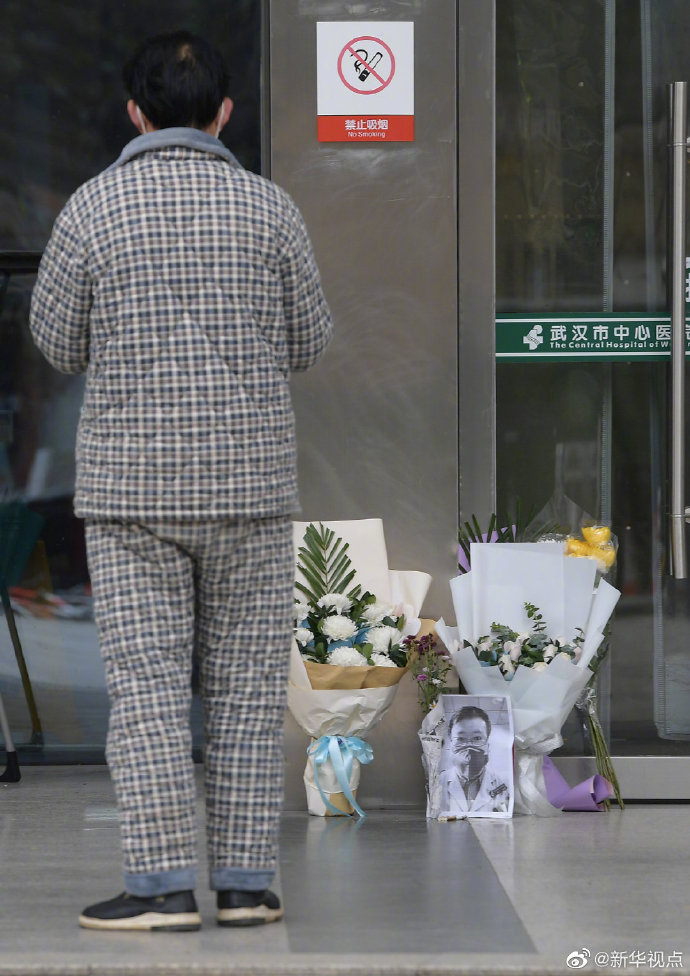 本文图片均来自微博@新华视点仿佛昨天的雨水没有干透,空气中还夹着阴冷。2月7日,在李文亮生前工作过的武汉中心医院后湖院区门诊楼门口,摆放着他的黑白打印照片,和祭奠鲜花。不时有穿着防护服的医护人员前去吊唁,有的武汉市民驻足静立,也有外地的人委托武汉朋友去献花。向你致敬!李文亮医生,请安息。