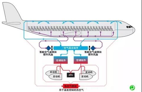 【客舱环境相关系统示意图】通常通过飞机发动机将外界的空气吸入飞机,在相应的系统将其调节到适合乘客的空气压力和温度之后供应到客舱。在绝大部分的现代机型中,约50%的舱内空气会被循环利用,与外界新鲜空气混合,一同进入客舱。