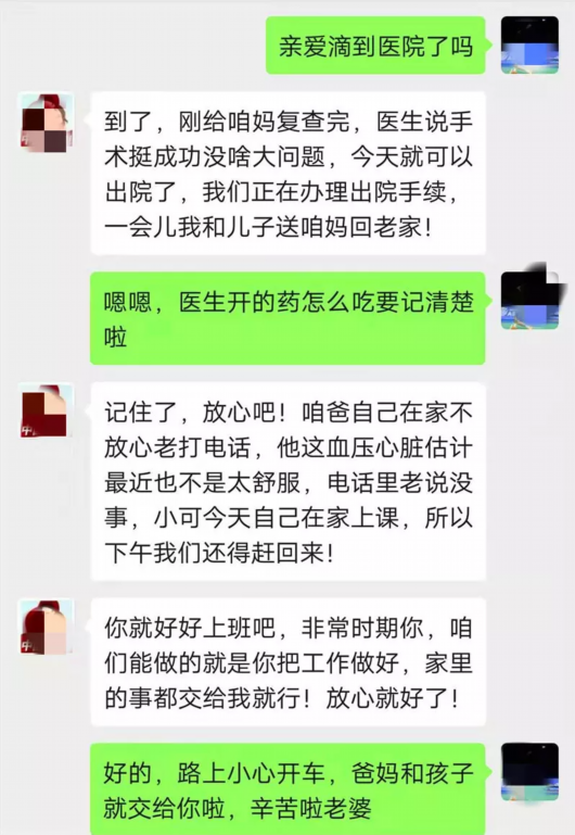 “家里没事吧?多开窗通风,让爸妈跟俩孩子喝水,尽量别出门。我回不去,家里上上下下都靠你了。”