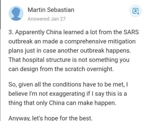 “非典”给中国留下了经验, 中国构建了一套应对类似疫情爆发的综合应急体制机制。火神山医院的架构不是说你对着图纸构思一晚上就能搞出来的。综合上述几点,不吹不黑,我觉得这件事只有中国能做到。总之,愿一切都好吧。