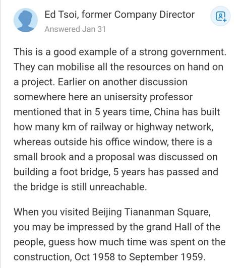 这说明了什么是一个强有力的政府,有能力调度手中的一切资源保证项目实施的能力。 前段时间,一个大学教授也提出了类似的问题:五年时间里中国建好了若干条铁路和高速路,而同样的5年,由于教授办公室外有一条溪流,所以建不建桥还在讨论,工程一直搁浅。