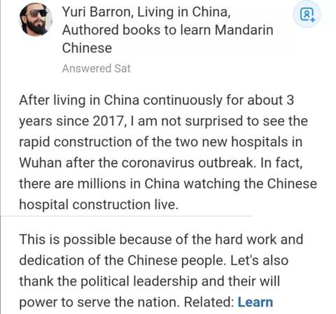 从2017年开始,我已在中国待了三年。我不奇怪,在疫情爆发后,两座医院在武汉迅速开工、拔地而起。不瞒你说,当时还有数百万网民在看医院建设的直播呢。中国完成此举,靠的是中国人民的勤劳上进、忠诚奉献。要感谢中国的执政党,感谢他们为这个国家服务的意志和决心。