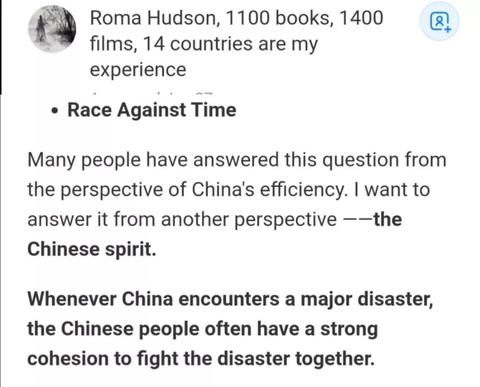 很多人从中国效率这个角度谈的,我想从另外一个角度谈谈,中国精神。 当重大灾难降临,这个国家的人民就会爆发出一股强大的凝聚力战胜灾难。