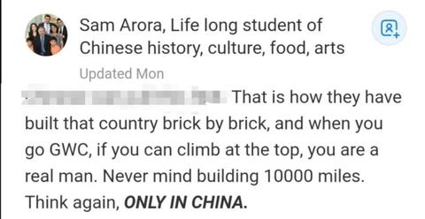 中国,是中国人一砖一瓦铸造的,如果你去长城爬到顶上,就已经是一个真汉子了,更别说还要搬砖建造1万英里的城墙了。想想吧,这只会发生在中国。
