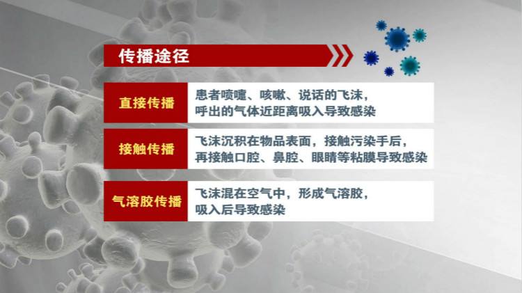 直接传播是指患者喷嚏、咳嗽、说话的飞沫,呼出的气体近距离直接吸入导致的感染;   气溶胶传播是指飞沫混合在空气中,形成气溶胶,吸入后导致感染;   接触传播是指飞沫沉积在物品表面,接触污染手后,再接触口腔、鼻腔、眼睛等粘膜,导致感染。