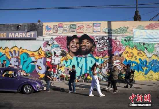 当地时间1月28日,球迷们来到洛杉矶一处绘有科比·布莱恩特及其二女儿吉安娜的壁画前寄托哀思。中新社记者 刘关关 摄
