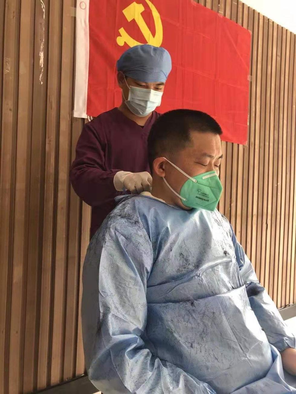 蒋孔明: “主要还是刚来的那两天,当时大家在培训的时候发现,穿脱防护服、戴帽子,不管怎么弄都有长头发会掉下来。那个时候大家就觉得很有必要把长头发理短,我也是那时候开始给大家服务理发。”