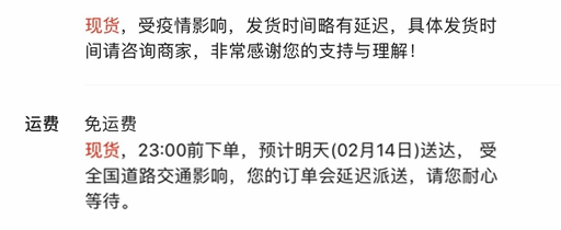 中新经纬客户端注意到,目前有多家电商已开通了情人节专题打折活动,随机点进几个页面发现,一些自营商品提醒“23:00前下单,预计2月14日送达,受全国道路交通影响,您的订单会延迟派送,请您耐心等待”。一些第三方商家售卖的商品也提示“受疫情影响,发货时间略有延迟,具体发货时间请咨询商家,非常感谢您的支持与理解!”