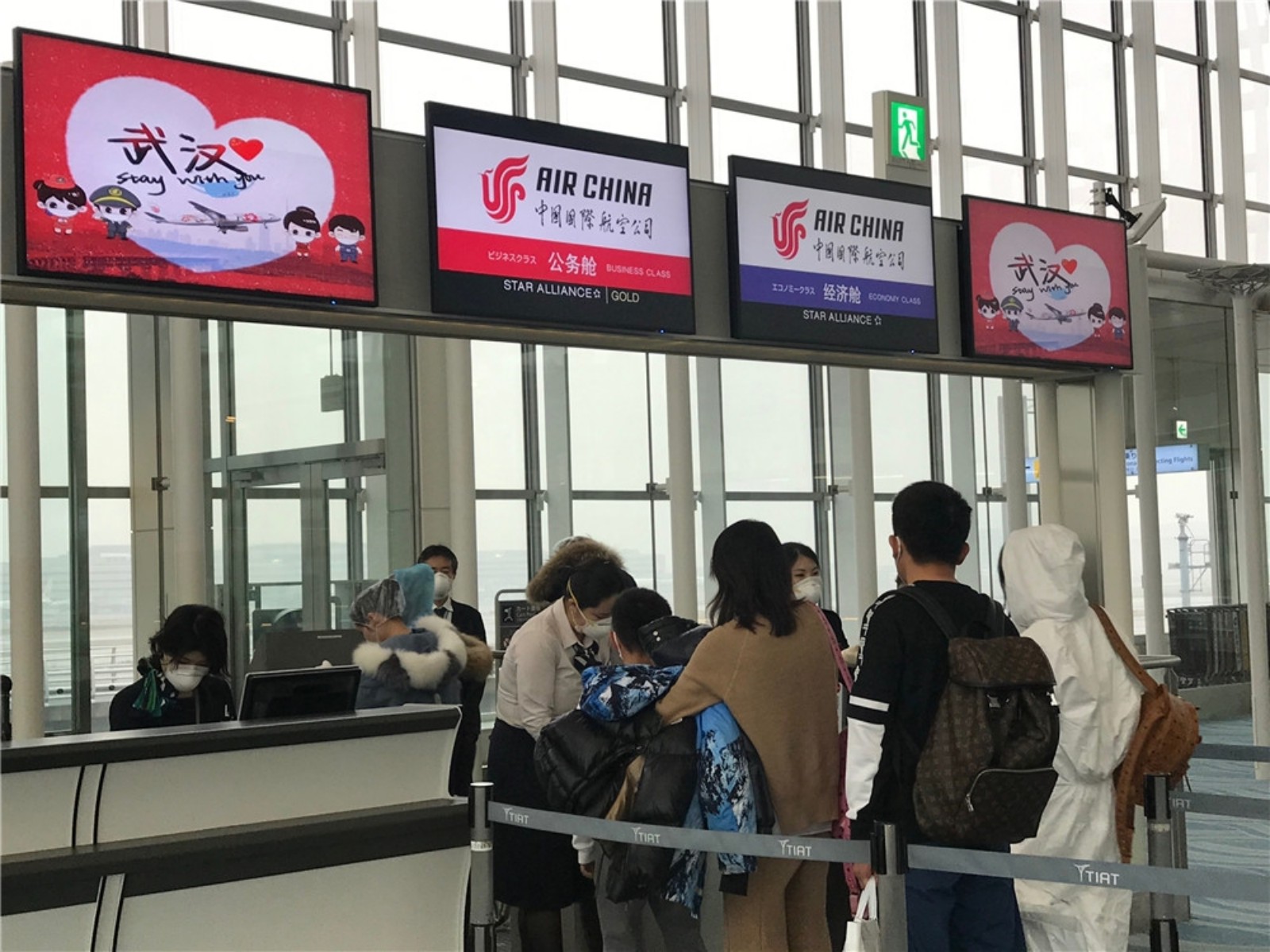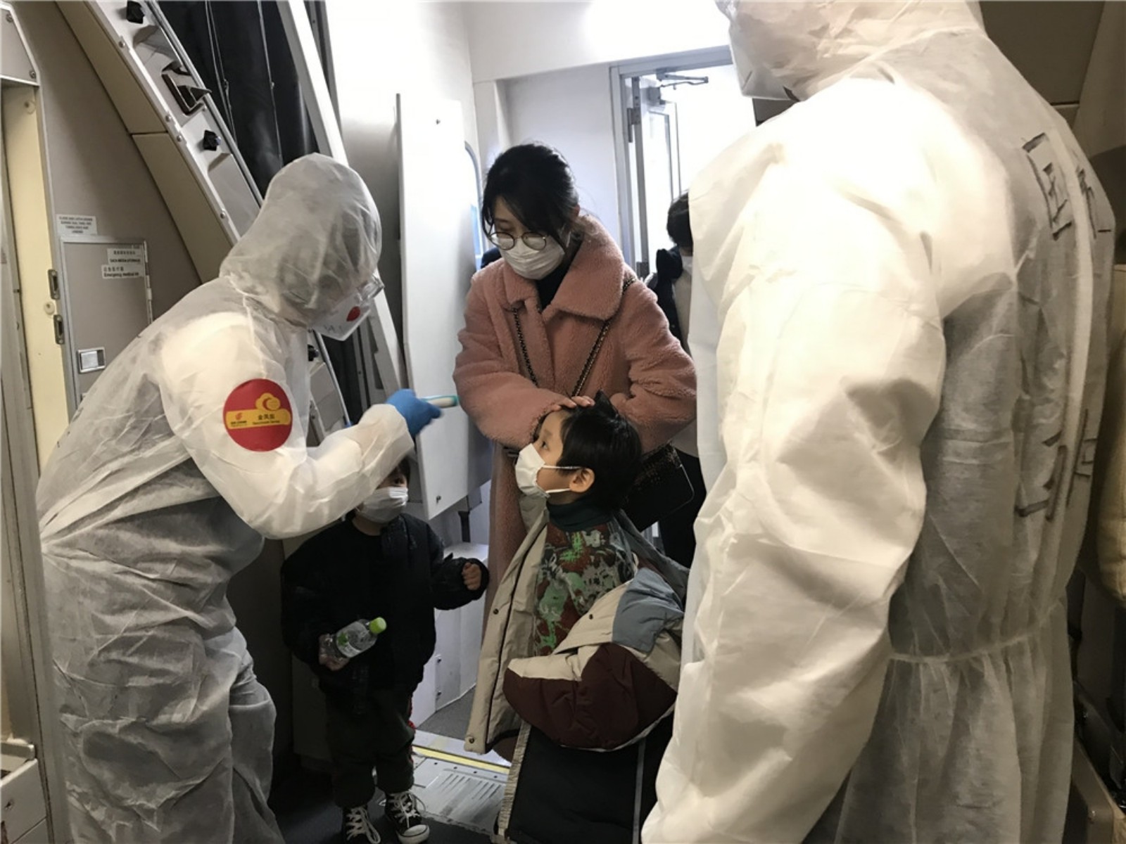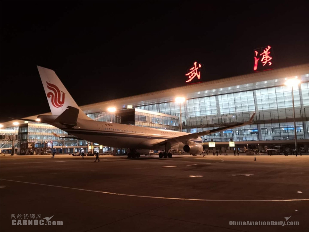 2月16日,在驻日本大使馆的统筹安排下,国航一架空客A330-300客机从东京直飞武汉,接回滞留在当地的207名湖北籍旅客,同机运抵的还有日本社会各界和华人华侨捐赠的近600件3.5吨的防疫物资。图为中航集团包机顺利抵达武汉。(来源:民航资源网)