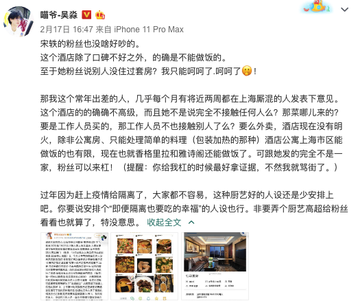 昨日,一位知名化妆师大V发文再次吐槽宋轶,他表示宋轶在酒店隔离期间一直晒照秀厨艺,“这个酒店的的确确不高级,而且她不是说完全不接触任何人么?那菜哪儿来的?要是工作人员买的,那工作人员不也接触别人了么?要么外卖,酒店现在没有明火,除非公寓房、只能处理简单的料理(包装加热的那种)酒店公寓上海市区能做饭的也有限,现在也就香格里拉和雅诗阁还能做饭了。可跟她发的完全不是一家,粉丝可以来杠!(提醒:你给我杠的时候最好拿证据,不然我就骂街了。)过年因为赶上疫情给隔离了,大家都不容易,这种厨艺好的人设还是少安排上吧。你要说安排个‘即便隔离也要吃的幸福’的人设也行。非要弄个厨艺高超给粉丝看看也就算了,特没意思。”
