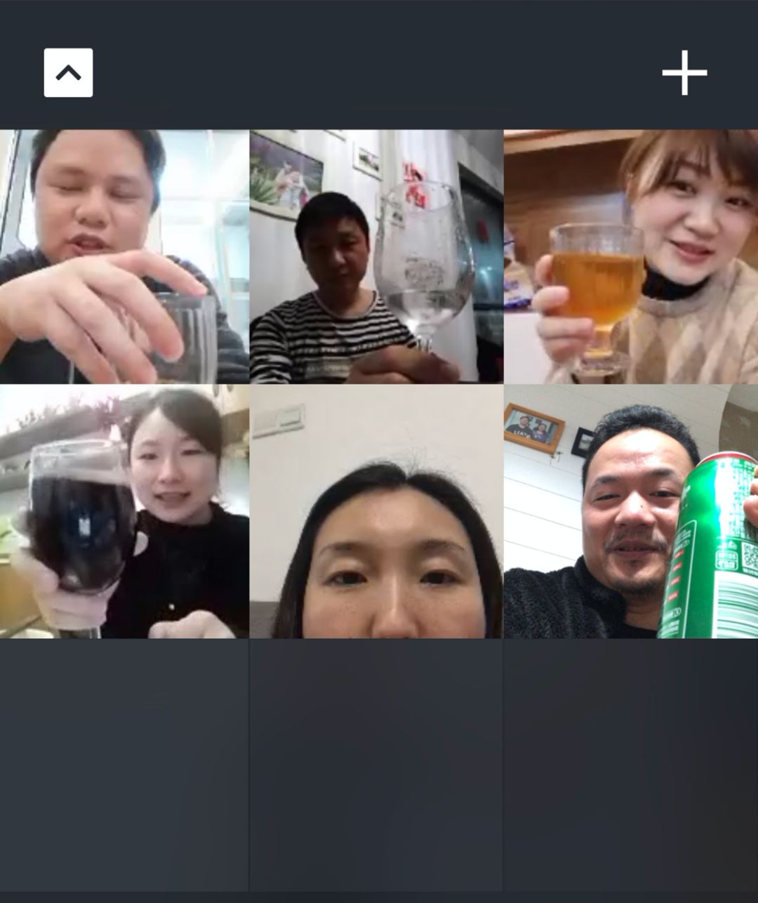 于是我们就想了一个办法,每天晚上 10 点左右,群里 5、6 个人一起打开视频聊天,一起「云喝酒」。