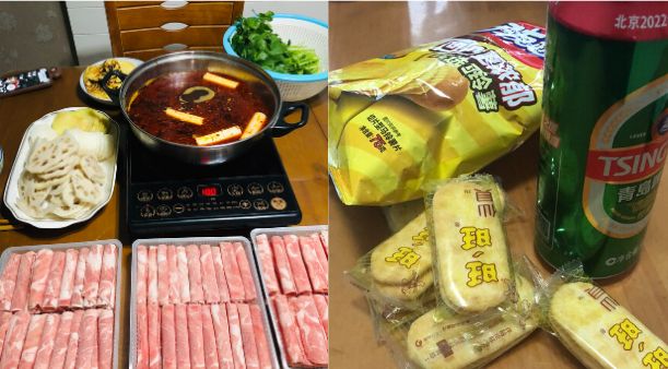 后来因为没有出门的机会,出门也买不到东西,家里的存货越来越少,我们的下酒菜就只剩点花生米、薯片。