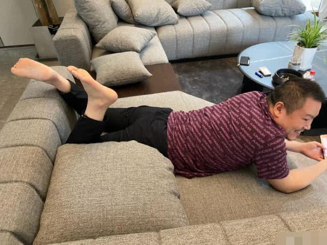 照片中,岳云鹏身穿红色T恤黑色长裤,翘着脚丫趴在沙发上简直不要太惬意,宅在家中许久未出门的他也懒得打理自己,胡子拉碴,之后玩游戏被发现的小岳岳顺势拿着一本书做遮掩,一脸尬笑。