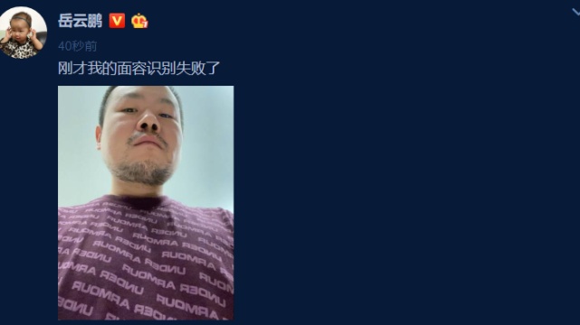 很快,岳云鹏也在个人社交平台晒出一张正脸自拍,并附文自侃道:“刚才我的面容识别失败了”,一脸胡茬并用鼻孔对镜头拍照的小岳岳这是完全放飞了。