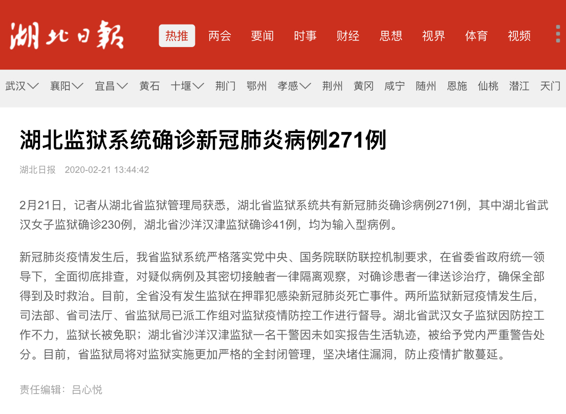 湖北监狱系统确诊271例,武汉女子监狱监狱长被免职
