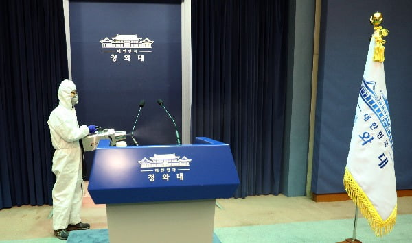 工作人员对青瓦台春秋馆消毒当这名75岁患者的活动轨迹公开后,首尔地方警察厅调查发现,有20多名首尔厅下属的警员在这一期间到过该医院。