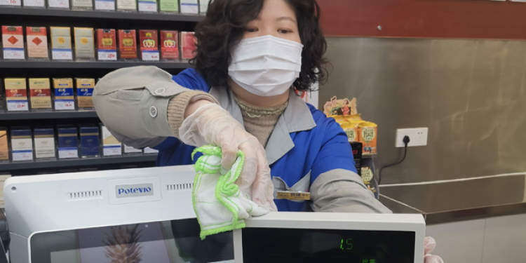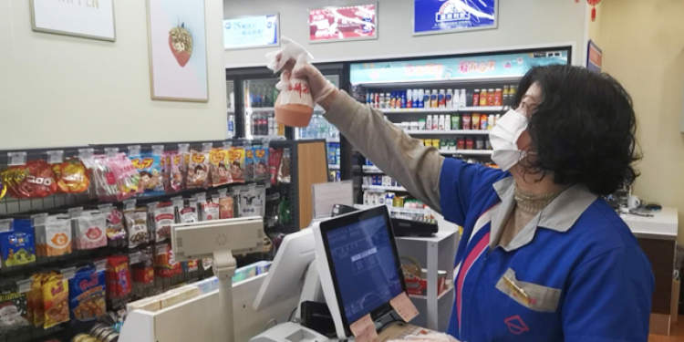 “店长,我们走了啊,晚上的消毒都做过了,你放心!” “好的,你们路上小心啊!” 一进店高久红就换上了工作服,嘴里不忘叮嘱夜班的四位同事,回家路上注意安全。 换好工作服后,她从柜台抽屉里拿出一盒手套,抽出两个给自己,又抽出两个拿给同上白班的同事小谭。 夜班的同事走之前,特意告诉高久红,消毒工作都已经做好了,但她整理完着装后,第一件事依然是拧开84消毒水的瓶盖,打开水龙头,往喷壶里兑上一整壶稀释配比好的消毒水。这是特殊时期,我每天上班第一件事就是消毒,消毒好了才放心,也是为了大家好。”高久红说,消毒工作以前也做,但因为疫情的缘故,公司要求门店把消毒的频率提升到两小时一次。