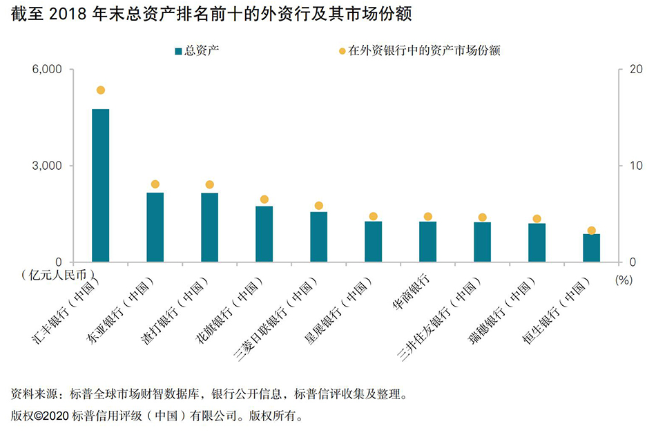 目前中国境内有41家外资行法人主体,总体资产规模占整个商业银行业的2%左右。虽然规模偏小,外资行在跨境业务方面具有显著优势。标普信评预计,随着人民币的逐步国际化和中国金融开放的进一步深入,外资行会迎来更多的业务发展机会。