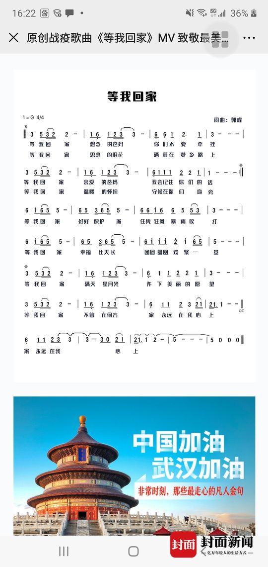 封面新闻记者电话釆访了正在北京的郭峰。他说:”温柔的唱腔触动每位听者温暖的内心,激昂的副歌表达了对团聚的渴望。我祝愿每一位战斗在一线的医护人员早日平安回家!武汉加油,中国加油!”