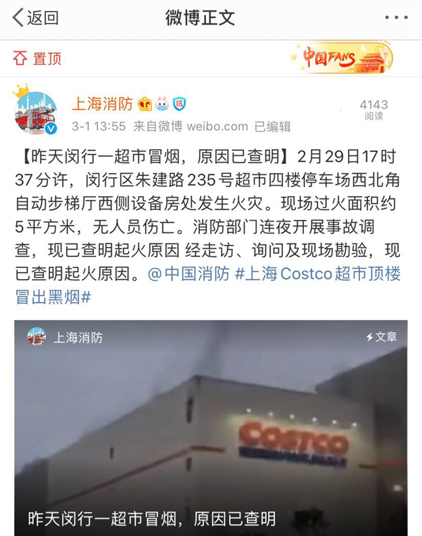 Costco超市发生火灾顶楼冒烟 消防已到现场扑灭