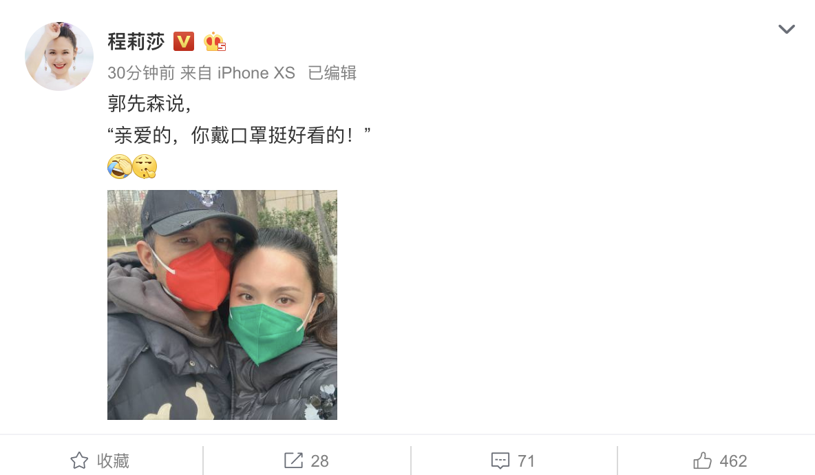 网易娱乐3月7日报道 3月6日,程莉莎在网上晒出与丈夫郭晓东的亲密自拍照,并发文称:“郭先森说,亲爱的,你戴口罩挺好看的!”照片中,夫妻二人的红配绿口罩十分吸睛,有网友开玩笑的说这难道是传说中的红男绿女吗?