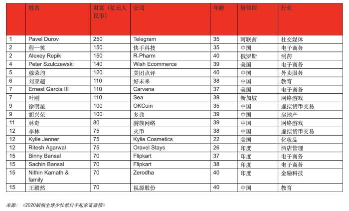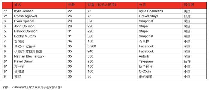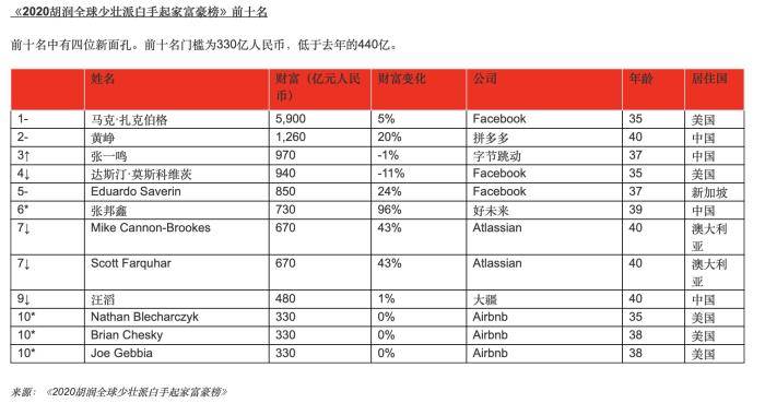 《2020胡润全球少壮派白手起家富豪榜》前10名单。