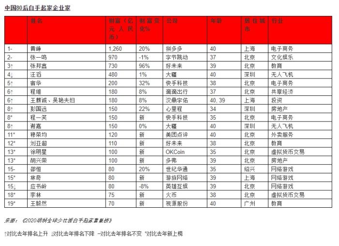《2020胡润全球少壮派白手起家富豪榜》上的中国80后白手起家企业家。