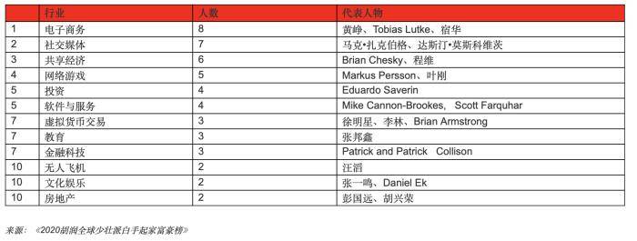 2020胡润全球少壮派白手起家富豪的行业分布情况。
