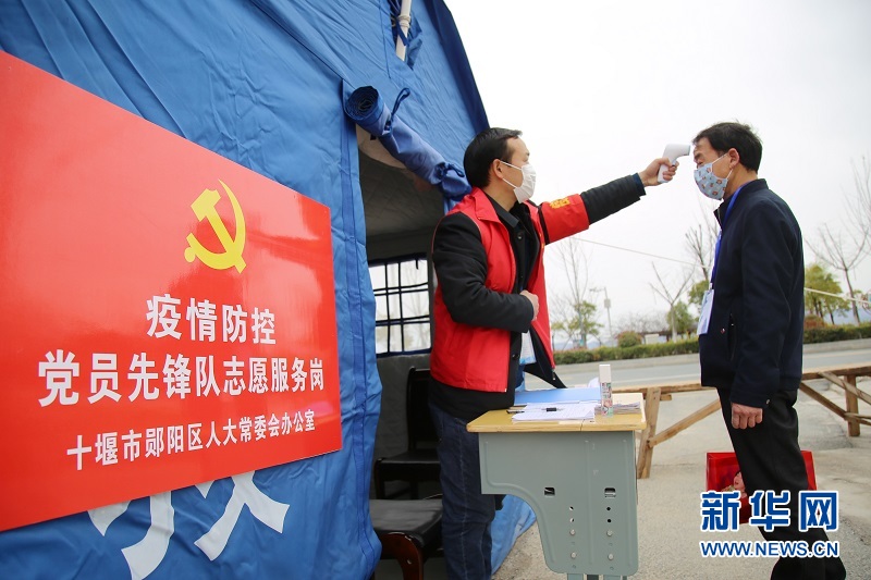 图为3月9日,在湖北省十堰市郧阳区城关镇北门社区,朱磊给出行人员测量体温。新华网发 曹忠宏摄