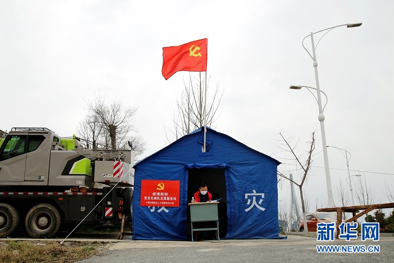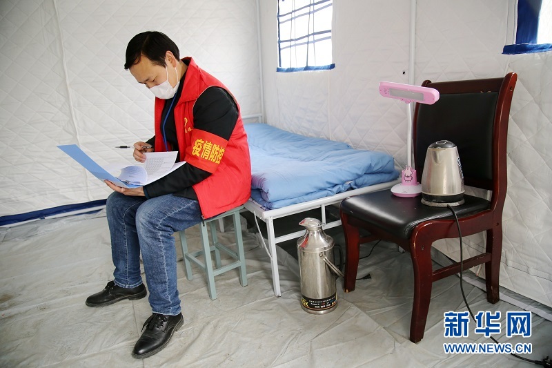 图为3月9日,朱磊在湖北省十堰市郧阳区城关镇北门社区疫情防控值勤点。新华网发 曹忠宏摄