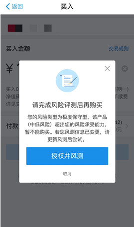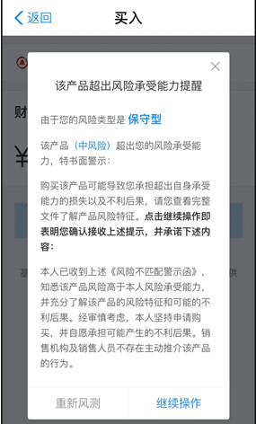 据了解,在支付宝上,用户在购买超出自己风险承受力的理财产品时,会弹出“风险提示”警告,告知用户当前产品的风险等级并予以提醒。这能让用户充分意识到理财产品存在的风险,减少冲动投资的概率,保证他们的权益。