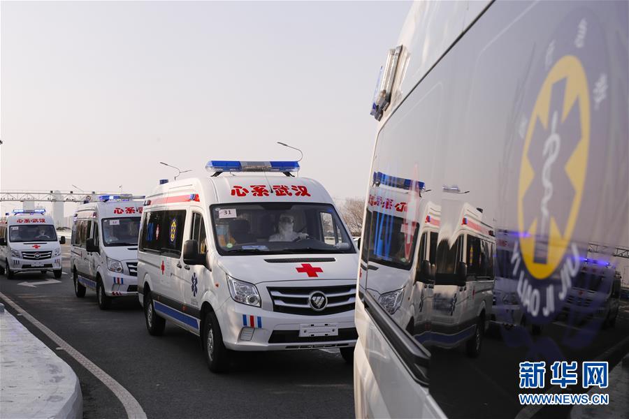 3月14日,几辆负压救护车前往武汉科技大学附属武昌医院转运新冠肺炎病人。  新华社记者 沈伯韩 摄