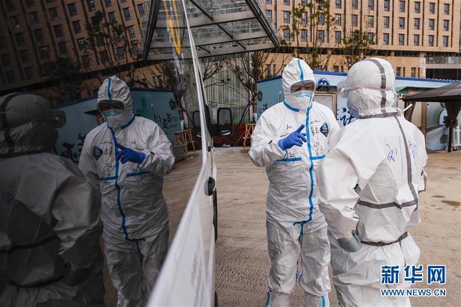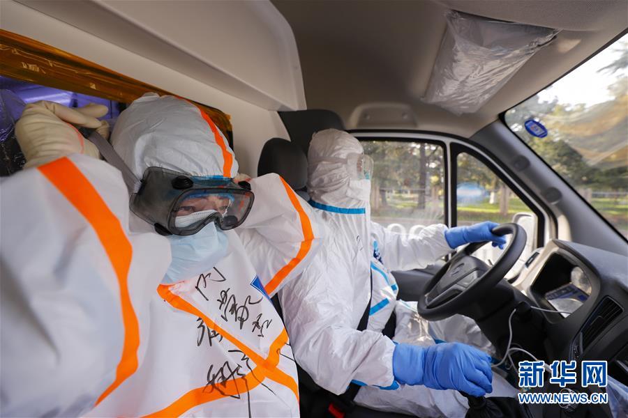 3月14日,来自上海市医疗急救中心的救护车驾驶员薛凯华(中)、来自内蒙古医疗队的护士陈丽华(左)抵达武汉科技大学附属武昌医院,准备转运病人。  新华社记者 沈伯韩 摄