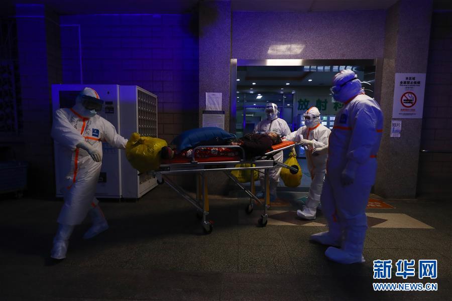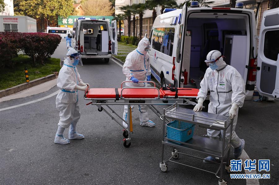 3月14日,车队队员们转运一名新冠肺炎病人离开武汉科技大学附属武昌医院。  新华社记者 沈伯韩 摄