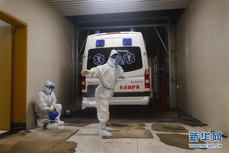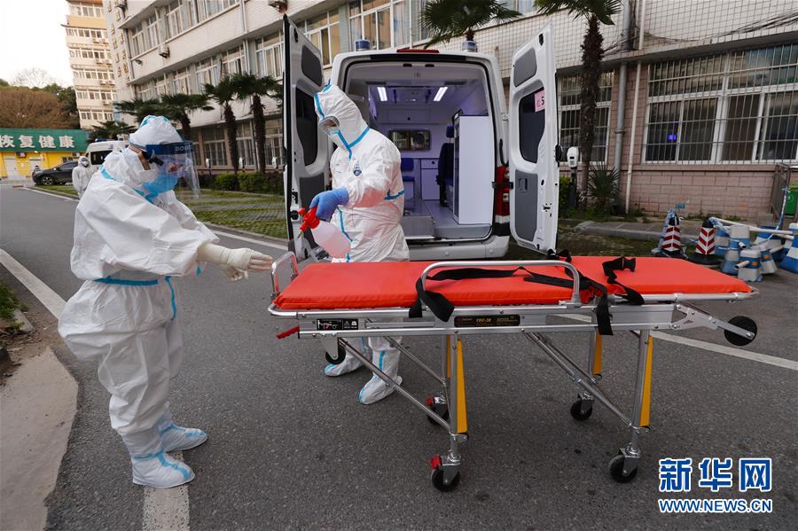 3月14日,在武汉科技大学附属武昌医院,来自上海市医疗急救中心的救护车驾驶员薛凯华(右)和来自内蒙古医疗队的护士陈丽华将新冠肺炎病人送走后,给担架和自己消毒。  新华社记者 沈伯韩 摄