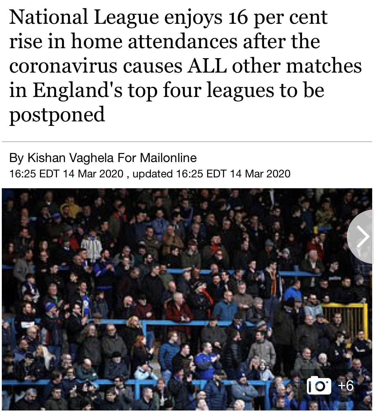 这位球迷所言非虚,每日邮报有报道指出,英超、英冠等职业联赛相继停下脚步,本周末照常进行的英格兰第5级别联赛单日上座率提升了16%。