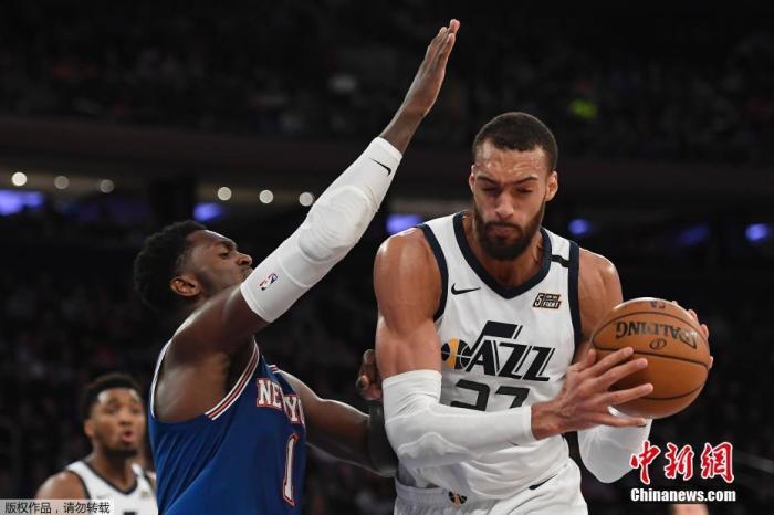 资料图:爵士中锋戈贝尔在比赛中进攻,他和图片左下角的米切尔目前均已确诊感染新冠肺炎。